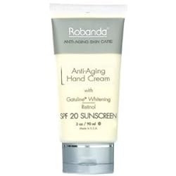 This revolutionary non-greasy hand treatment is the first ever product to combine Retinol, SPF 20 sunscreen and Gatuline Whitening (a complex lightening ingredient derived by fermentation of Kojic and Lactic acids with licorice extract). Robanda Anti-Aging Hand Cream is proven effective to fade dark spots as well as providing maximum sun protection. Vitamin A antioxidants in the formula simultaneously strengthen nails. 3 oz.