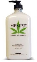 Hempz Herbal Moisturizer is an all-day herbal body lotion that provides nourishment and dramatic rehydration through the use of pure hemp seed oil and extract. ?Pure hemp seed oil and extract are rich sources of essential fatty acids, amino acids and nutrients vital to providing skin hydration, nourishment and conditioning. ?Shea Butter, Ginseng and natural extracts calm, cool and soothe skin. ?Vitamins A, C and E neutralize environmentally triggered oxidants and help minimize the look of fine lines and wrinkles. ?Provides 12-hour moisturization. ?THC-Drug Free.Fragrance: Banana and fresh breezy floral.