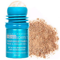 (More customer reviews)Colorescience's Sunforgettable SPF is a neat idea - sunblocking powder in a roll top bottle that's supposed to be easy to apply. I do like the fact that the powder is truly unscented. However, it is also a major pore-clogger, and the roller ball dispenses the powder in big wasteful clumps instead of evenly. You'd be better off buying their powder refills, which are leas expensive, and applying a light amount of powder by using a big brush.